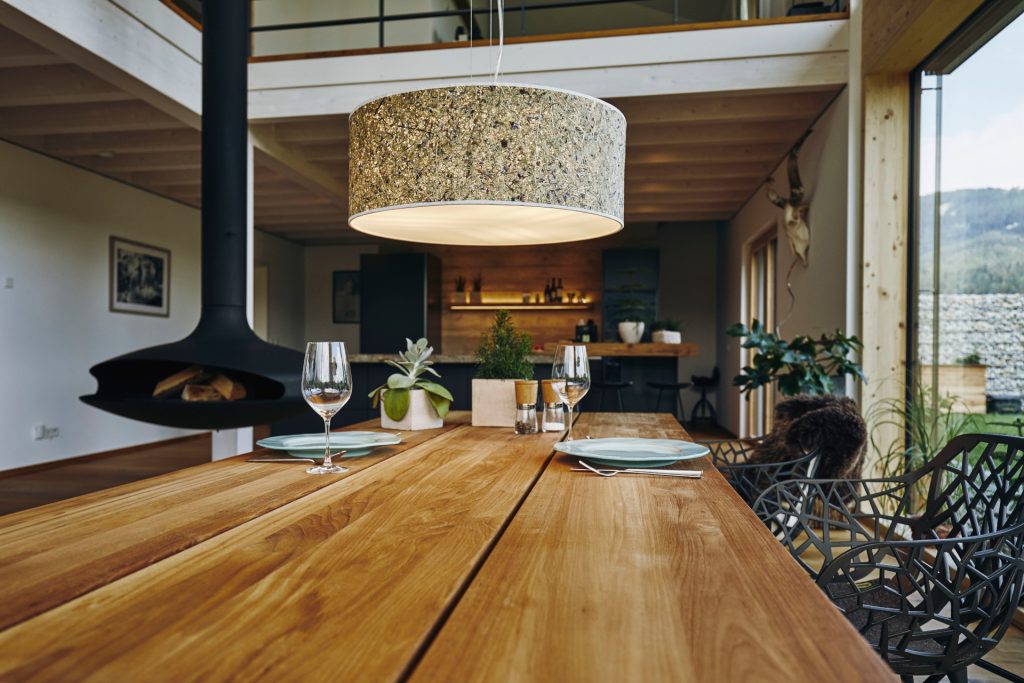 Für die Lampenschirme werden neben Holz- und Steinfurnieren auch ORGANOID Naturoberflächen verwendet.