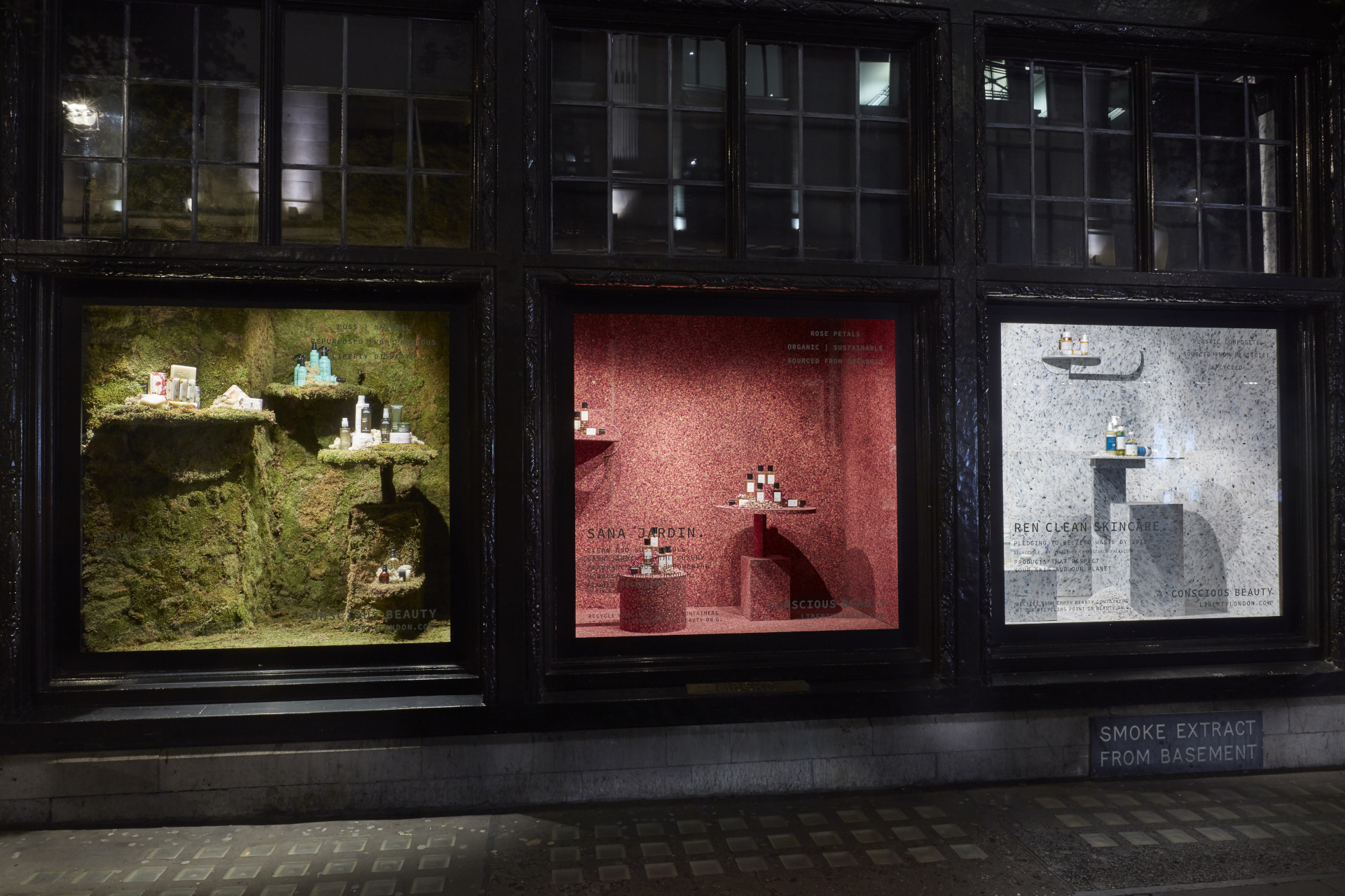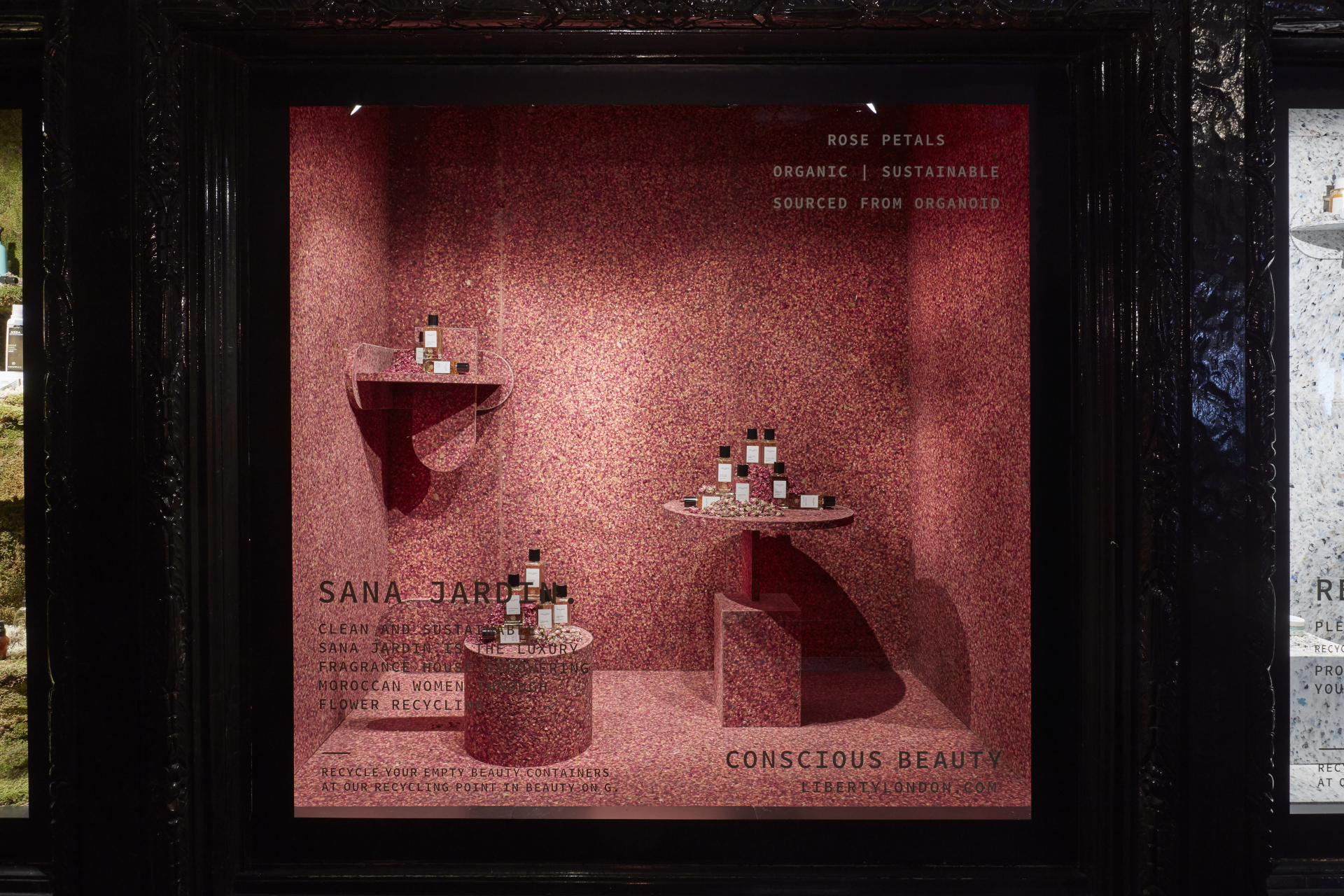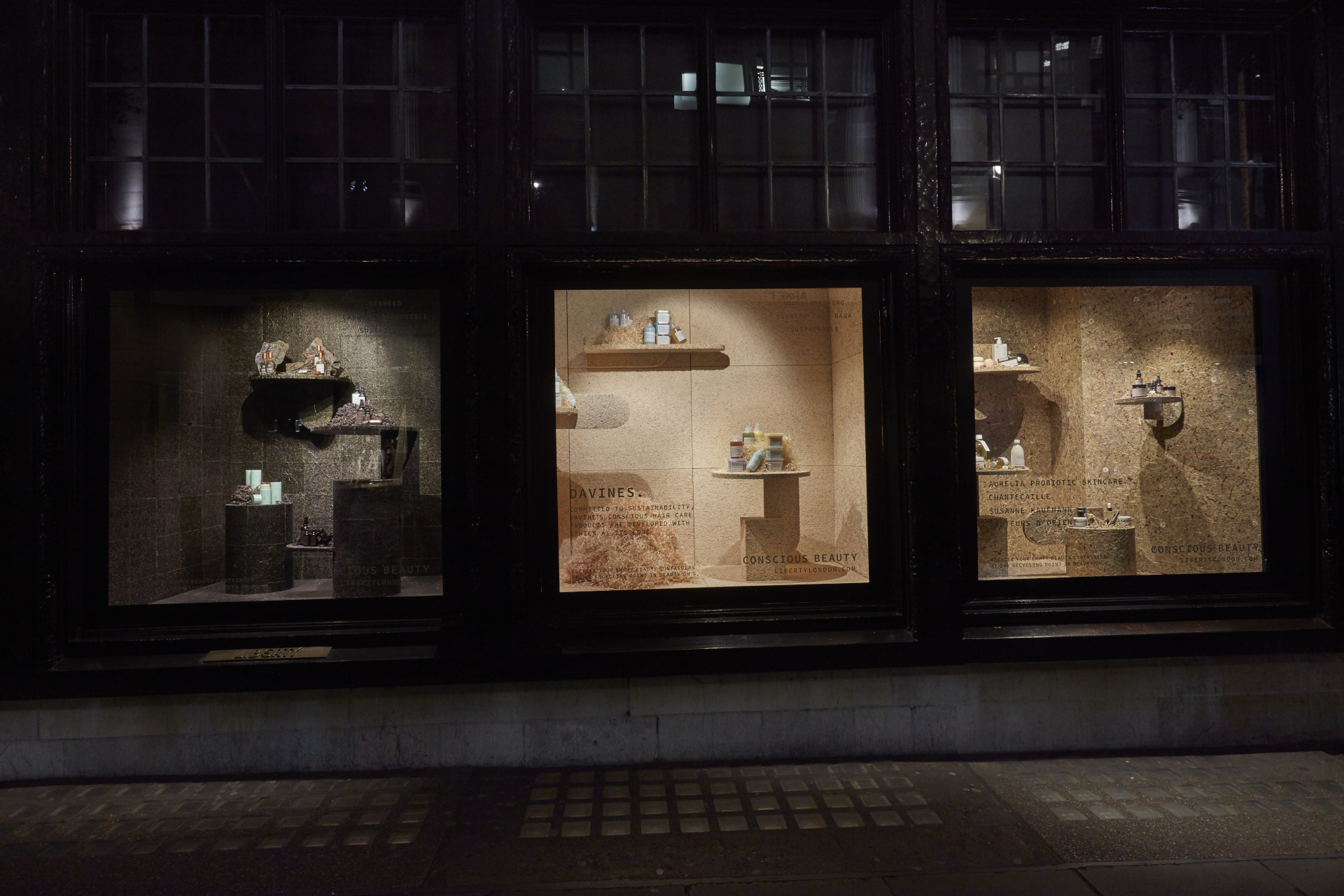 Das weltbekannte Liberty Kaufhaus in der Londoner Regent Street präsentiert im Frühjahr 2019 nachhaltige Kosmetikprodukte in mehreren Schaufenstern – unter anderem mit den ORGANOID Naturoberflächen ALMWIESN und ROASNBLIATN.