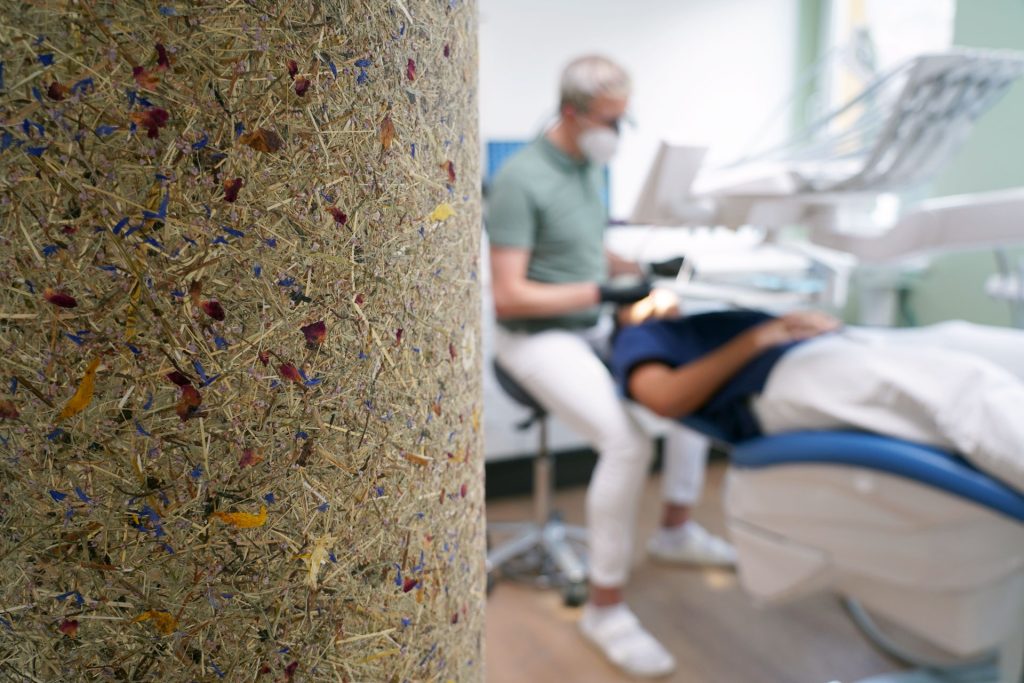 Das handgesenste Almheu bringt ein Stück Tiroler Natur in die Praxis und schafft ein harmonisches, angenehmes Umfeld für Patienten und Team. Besonders eindrucksvoll: Die Oberfläche wurde flexibel an einer Säule angebracht und zeigt damit, wie vielseitig ORGANOID Materialien eingesetzt werden können.