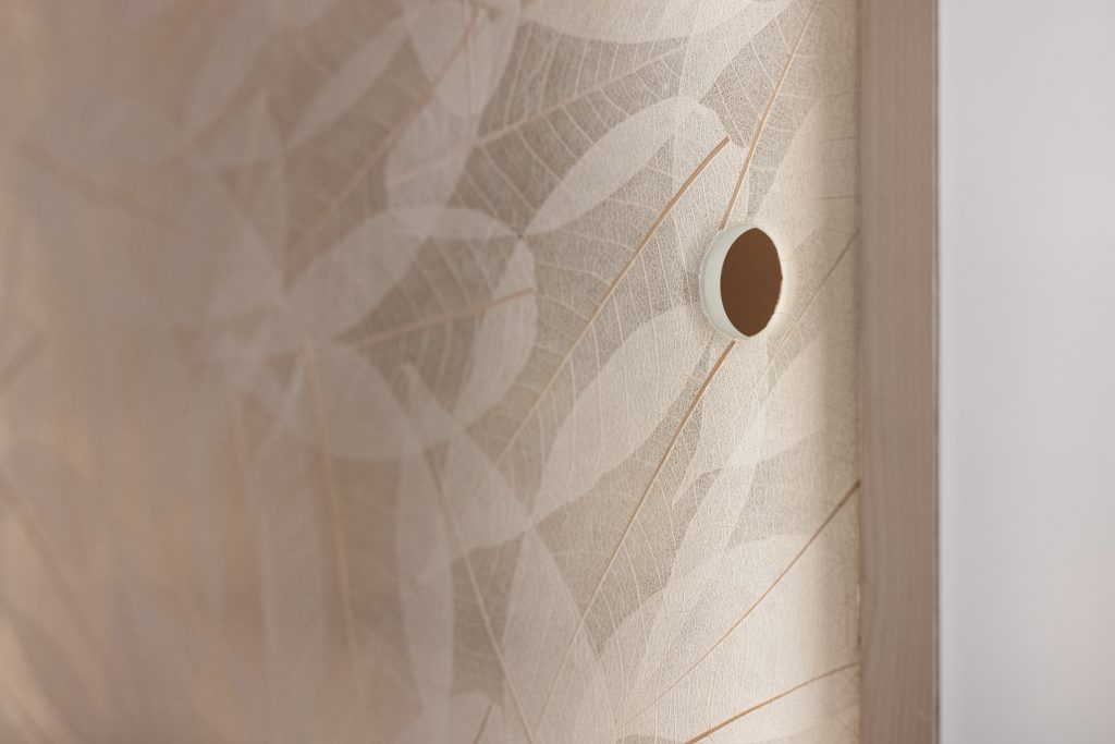 Das FSC-zertifizierte Goldpapier setzt mit seinem Schimmer edle Akzente im Innenraum und wird als Trägermaterial selbst zum prägenden Bestandteil des Oberflächendesigns.